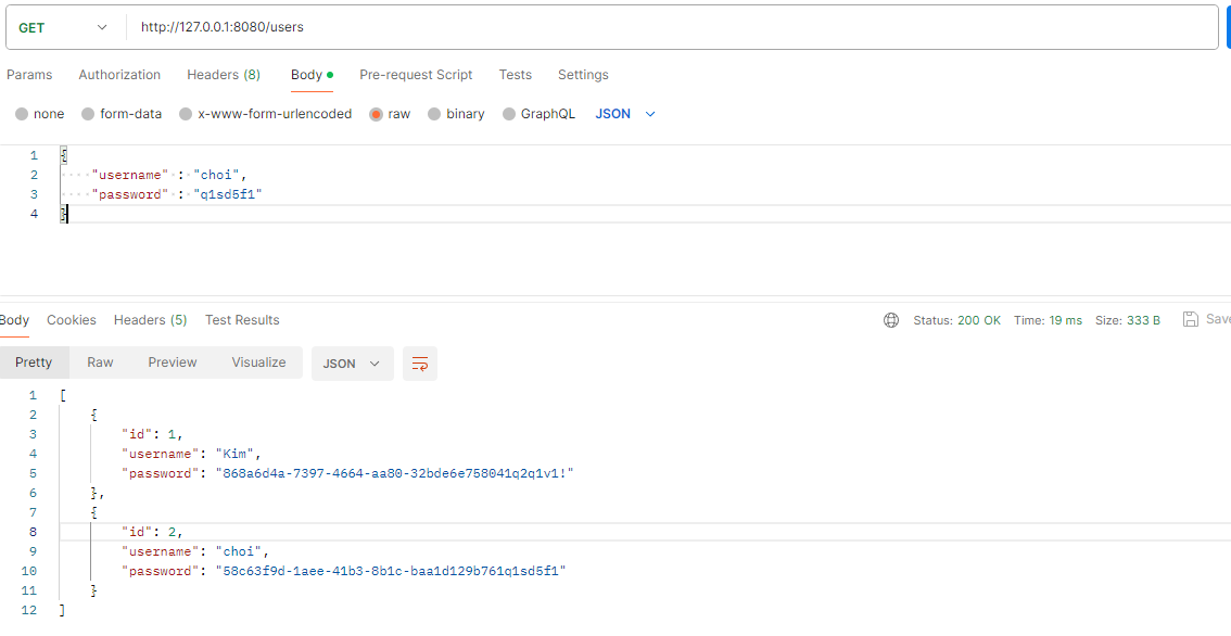 Postman을 서서 테스트 해보면 작성한 기능들이 잘 작동하고 있음을 확인할 수 있다.